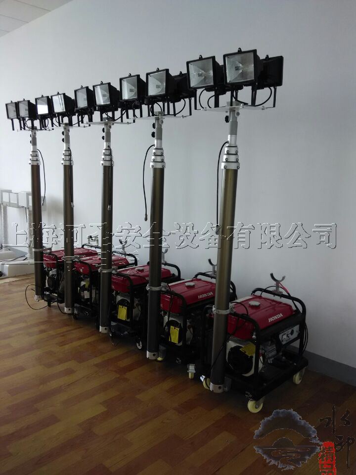 移動照明燈 采用氣動伸縮氣缸作為伸縮調節,提升高度為4.5米,升降可調節燈的照射遠近角度,燈光半徑30-50米。